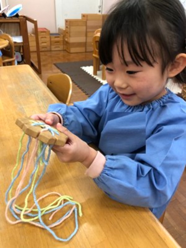 室内では早速、毛糸遊びが始まっています。(織り機・ポンポン鳥・リリアン・指編み等…)