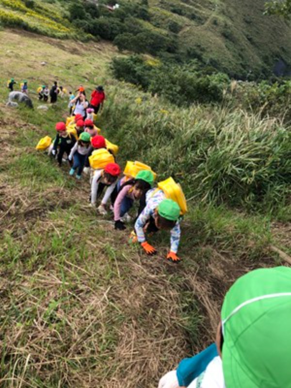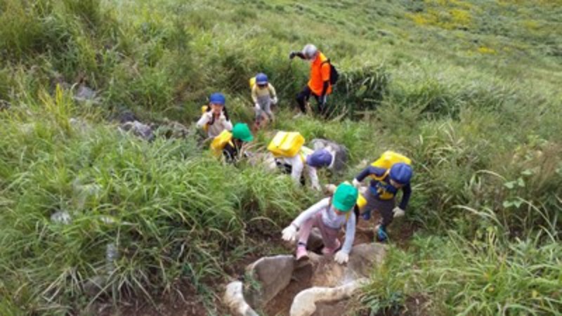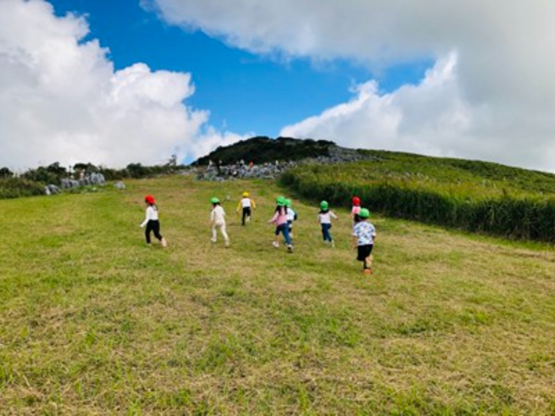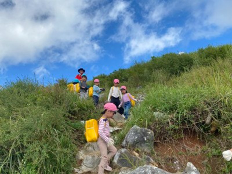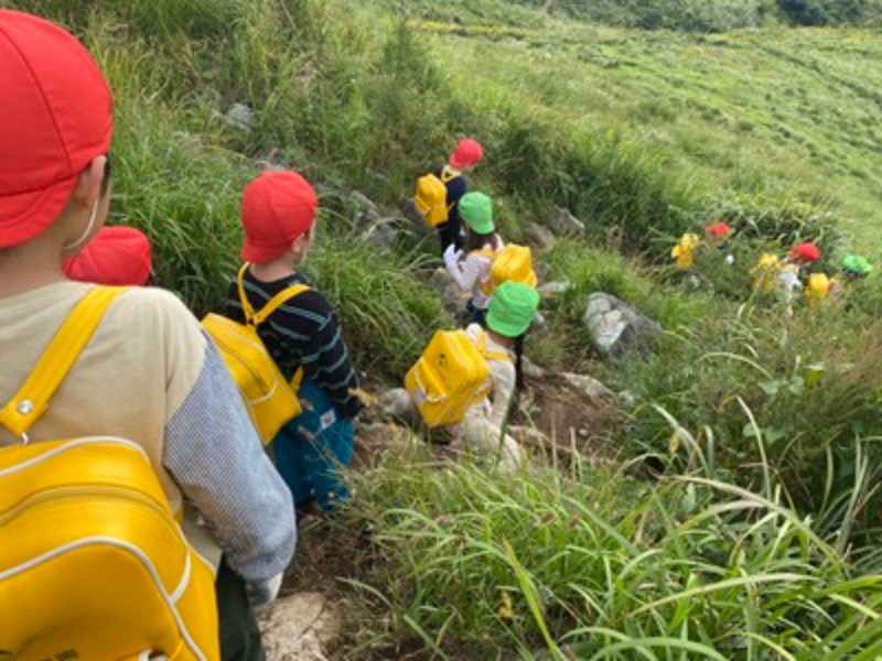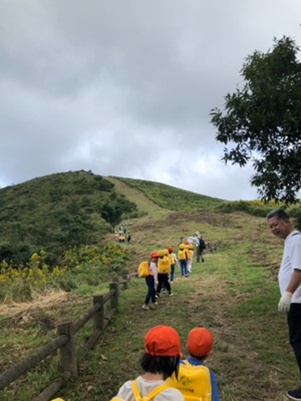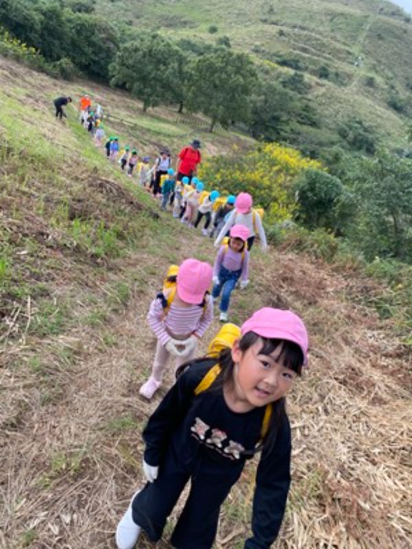 幼児部の1年 Album 『平尾台』の山登り…年長児 2025/10/17 秋晴れの空の下、年長児たちはカルスト台地で知られる平尾台へと足を踏み出しました。登りは少し汗ばむほどの道のりでしたが、山頂にたどり着いた瞬間、目の前に広がる絶景と雲の近さに、子どもたちの瞳は輝きました。その感動を分かち合いながら、みんなで食べたおにぎりの味は、何よりも格別だったようです。頂上では、バッタやカマキリにも出会えて、更に喜びが増した子も♡園に戻ると、年中・年少児たちに向けて、年長児たちは目を輝かせながら登山の思い出を語っていました。「雲が近かったよ」「おにぎりがすっごくおいしかった!」と、言葉だけでなく身振り手振りを交えて伝えるその姿は、まるで小さな語り部のよう。自分の体験を自信をもって伝えるその姿に、心の成長を感じました(*^_^*)自然の中で得た経験は、子どもたちの心に深く刻まれ、仲間とともに歩んだ時間が、確かな絆と更なる自信を育んだようです。 << 一覧に戻る