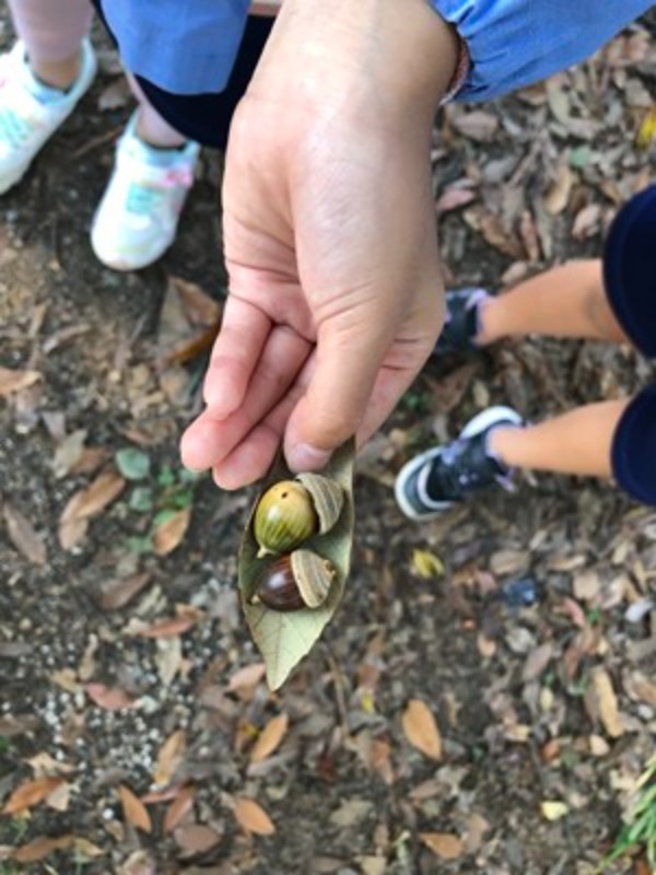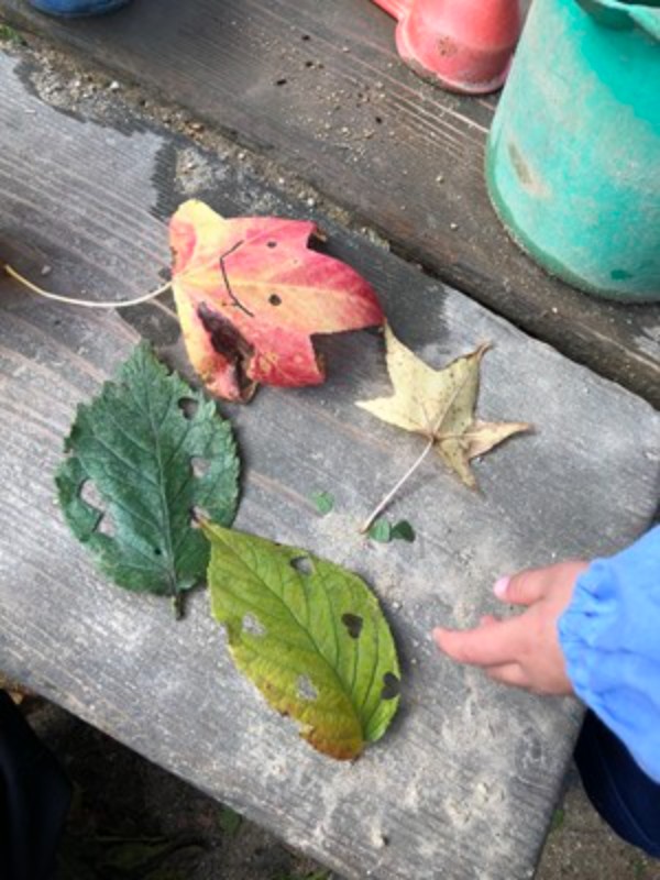 色づいた葉が子ども達の手のひらに舞い降り、そこから新しい遊びが広がっていきます。葉っぱに穴をあけてお面にしたり、集めて花束にしたり…。自然の贈り物を工夫しながら楽しむ姿は、秋ならではの豊かさを感じさせてくれます。