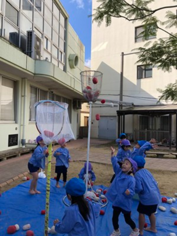 運動会が終わった後も、玉入れや竹太鼓に挑戦し、余韻を味わいながら遊びを続ける子ども達。ひとつの行事が終わっても、その楽しさをまだまだ楽しむ子ども達は、まさに「遊びを十分に味わう」瞬間です。