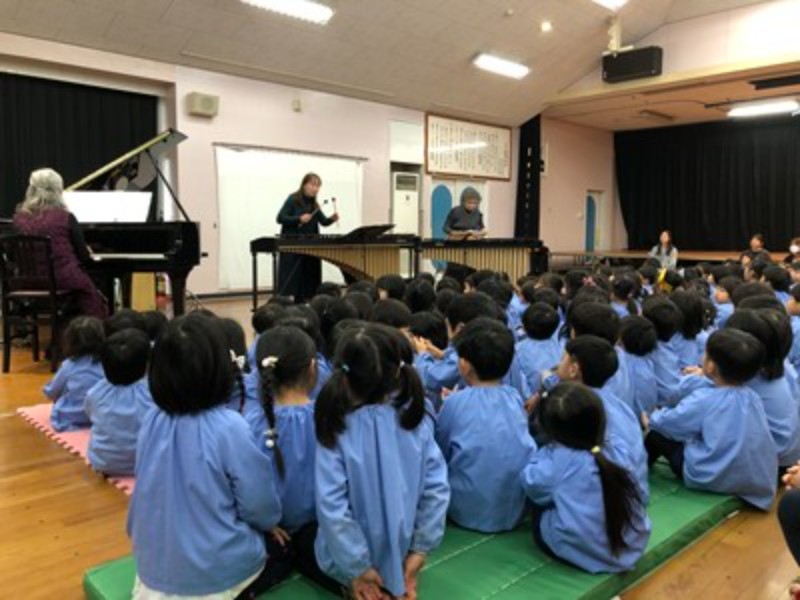 子ども達は、目の前で奏でられる“生の音”に胸を躍らせ、楽器の名前を聞くたびに「どんな音がするんだろう」と期待に満ちた表情を見せていました。マリンバの温かい木の響き、ピアノの澄んだ音色が重なるたびに、会場全体がひとつになっていくようでした。
