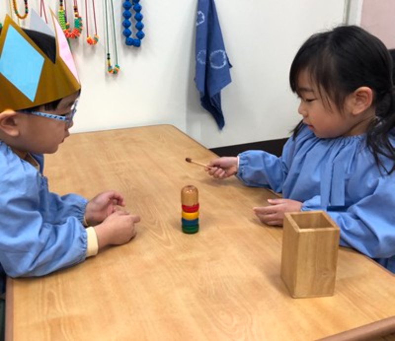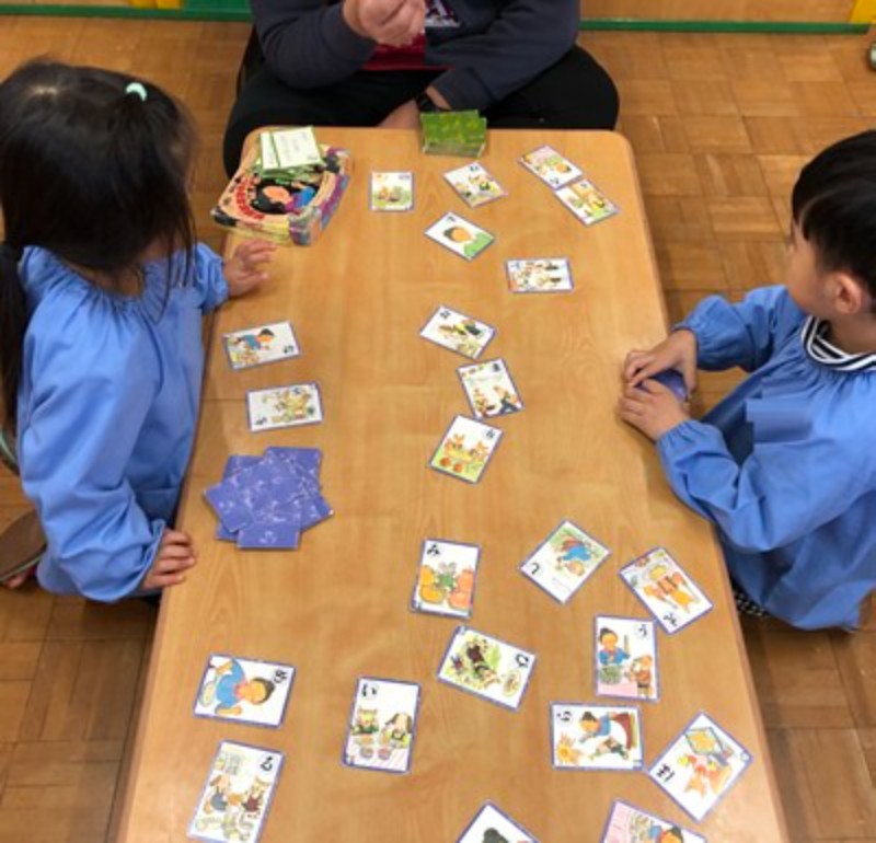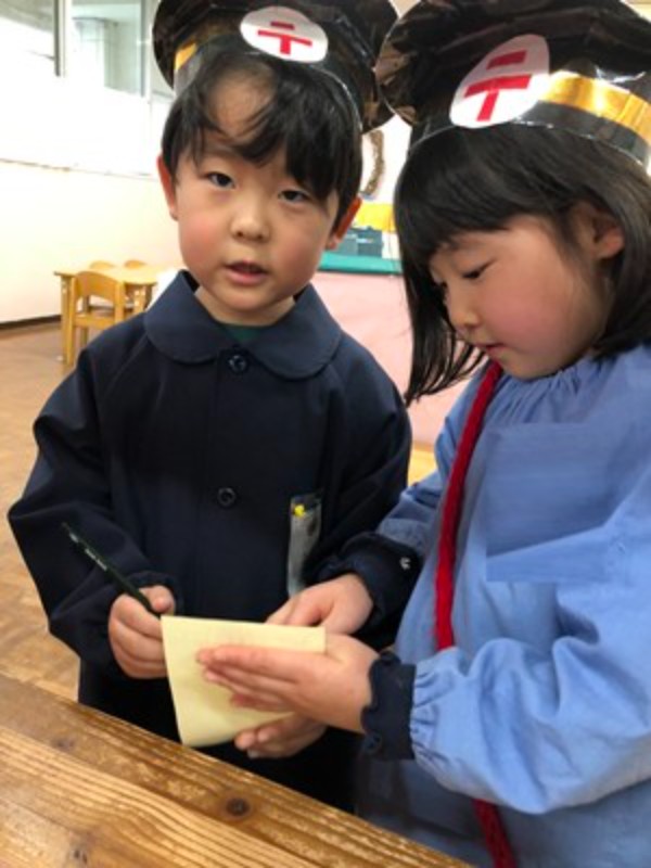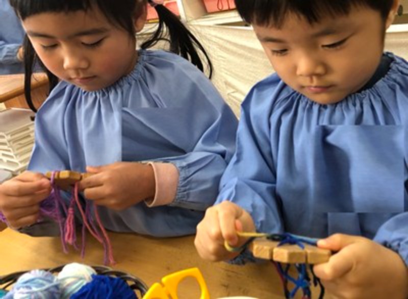 ままごとコーナーでは、おせちやお雑煮が美味しそうに盛りつけられ、子どもたちはにこにこ顔で「いただきます!」。まるで本当に味わっているかのように、嬉しそうに食べる姿が見られます。かるたの札を真剣なまなざしで探す子、達磨落としの木の音をリズムよく響かせる子。それぞれの遊びに夢中になる姿からは、集中する力や工夫する楽しさが伝わってきます。毛糸のコーナーでは、ふわふわの糸が小さな指先に命を吹き込まれ、「指編み」でつくるあたたかな作品や、「くみひも」が描く色とりどりのハーモニーが広がります。どれも世界にひとつだけの、心のこもった宝物です。そして、子どもたちの心をくすぐるもうひとつの遊びが「郵便ごっこ」。正月に届いた年賀状のうれしさを思い出しながら、自分たちでも手紙を書いて、手作りのポストにポトン。配達係になって友達に届ける姿は、まるで本物の郵便屋さんのようです。文字や絵に気持ちを込めて届け合うやりとりには、やさしさや思いやりがあふれています。